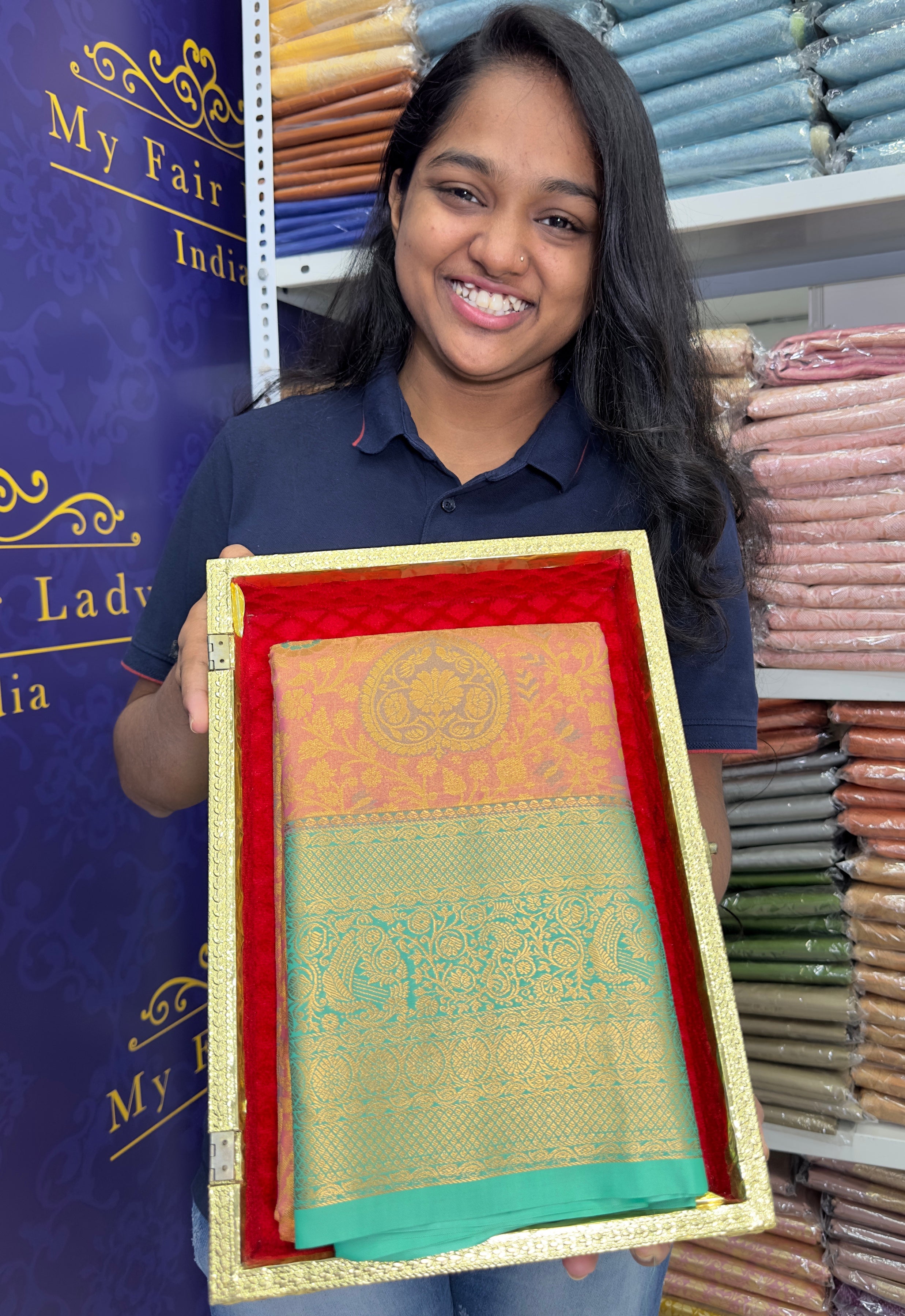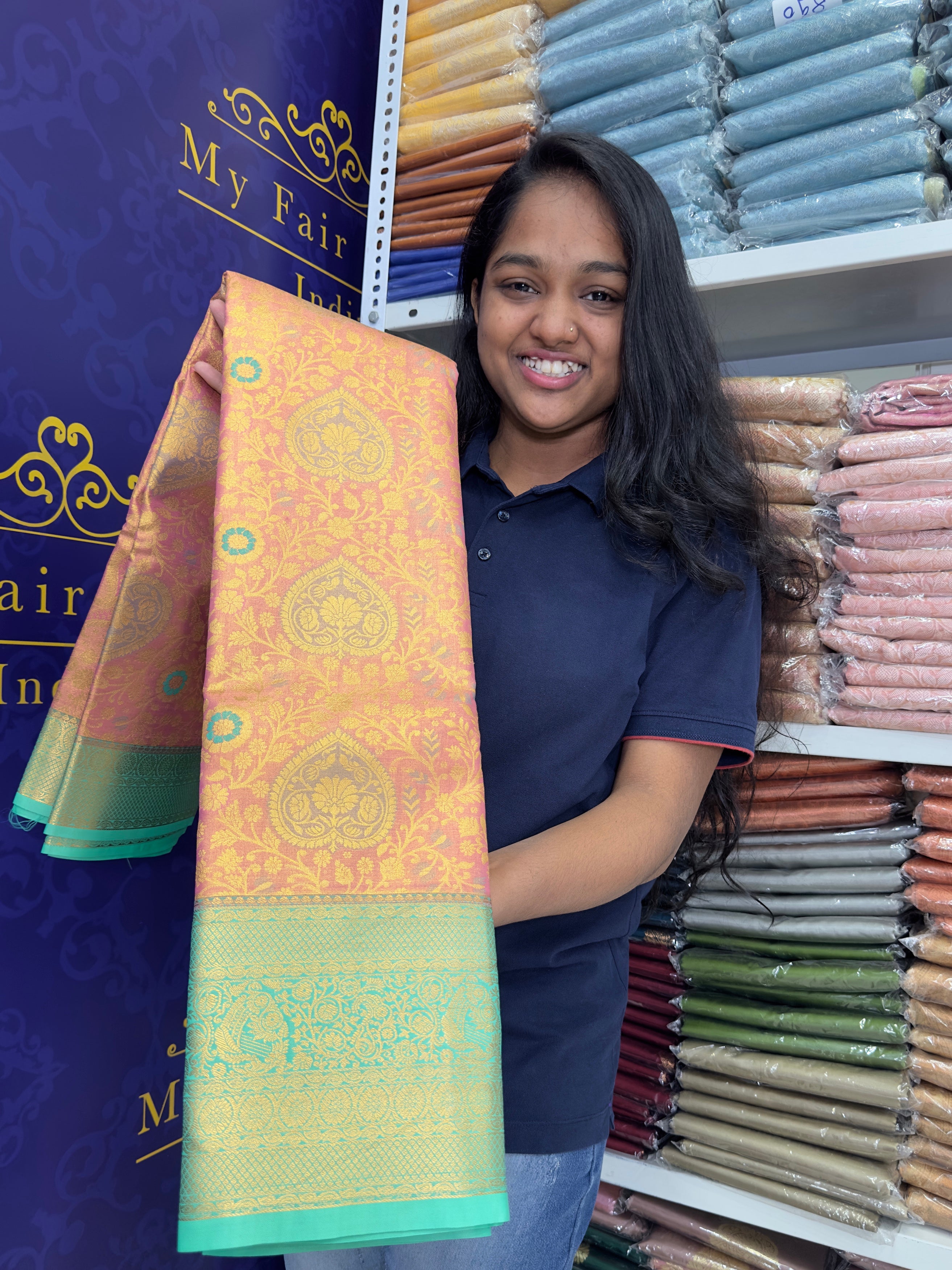 Premium Brocade Semi-Silk Saree Peach X Dark Teal Colour- [Code 990]