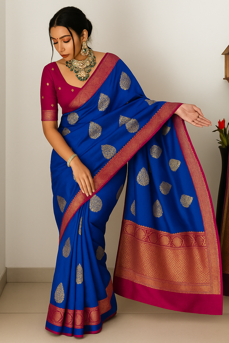 Butta Semi-Silk Saree Dark Blue Colour - [Code 1009]