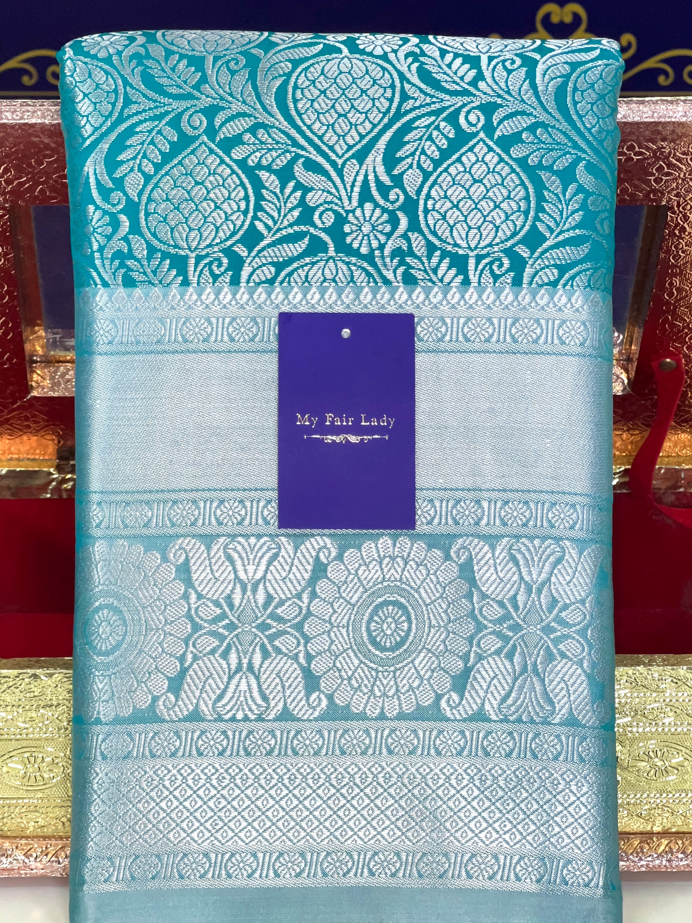 Brocade Semi-Silk Saree Aqua Blue Colour - [Code 672]
